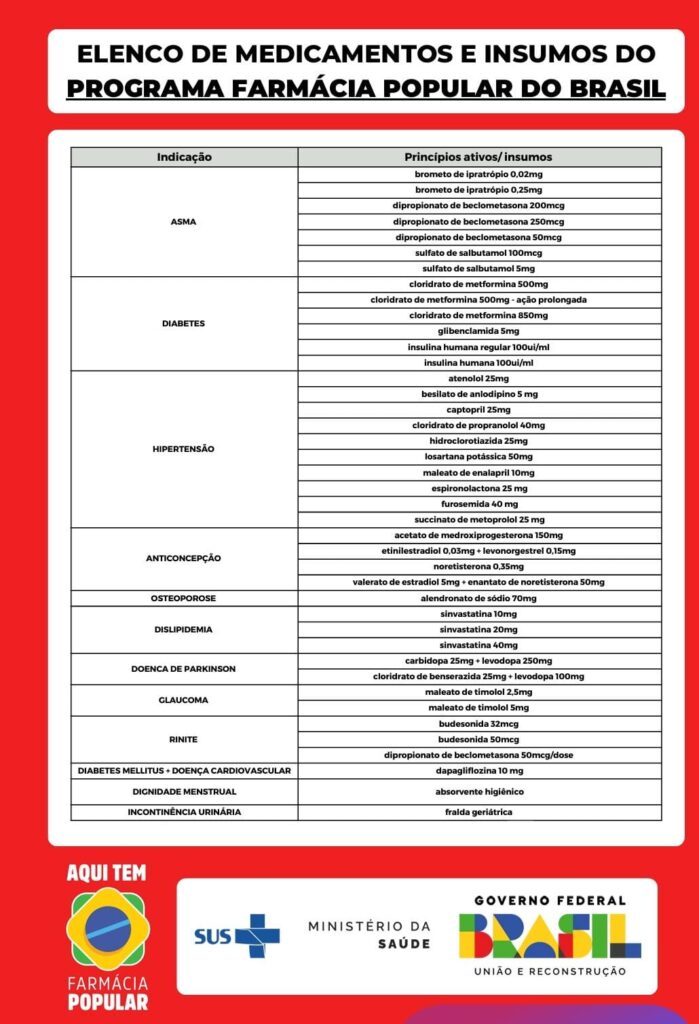 Além dos novos itens gratuitos, o Farmácia Popular mantém a oferta de medicamentos para hipertensão, diabetes, asma, osteoporose, dislipidemia, rinite, Parkinson e glaucoma, além de contraceptivos, absorventes higiênicos pelo Programa Dignidade Menstrual e fraldas geriátricas.